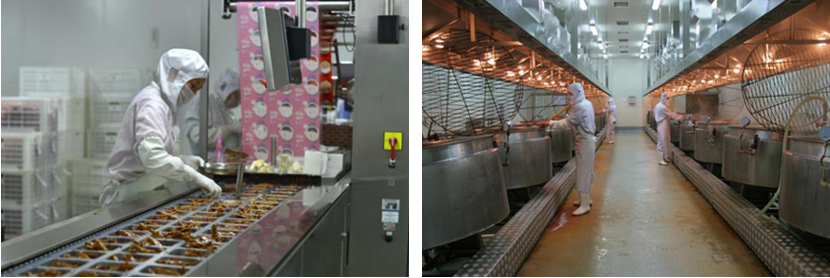 阿滿食品擁有先進(jìn)的自動(dòng)化生產(chǎn)車間,包括前處理車間、熟制車間、香腸灌制車間、油炸車間等。生產(chǎn)車間選自德國先進(jìn)生產(chǎn)線打造無菌化生產(chǎn)車間,保證產(chǎn)品質(zhì)量更穩(wěn)定;并使用行業(yè)較為領(lǐng)先的糖熏爐,糖熏爐具有優(yōu)異的發(fā)煙及循環(huán)系統(tǒng),可使?fàn)t內(nèi)的煙霧均勻分布,360度對產(chǎn)品進(jìn)行無死角熏制,從而使肉制品著色均勻,色澤美觀,保證產(chǎn)品具有較高的出品率。清洗車間引進(jìn)全自動(dòng)刷筐機(jī),機(jī)器通過熱堿水噴淋、熱水高壓噴淋以及自來水循環(huán)噴淋,三次清洗最大程度;降低油脂筐內(nèi)殘留滋生細(xì)菌。